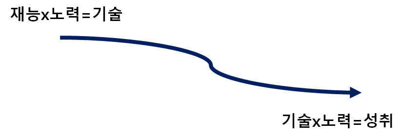 여기서 재능은 노력을 쏟았을 때 기술이 향상되는 속도를 뜻합니다. 같은 시간을 들여 공부하거나 연습해도 기술이 능숙해지는 속도가 빠른 사람은 분명히 있을 것입니다. 훌륭한 스승이나 조언자를 만나는 기회도 해당될 것입니다. 자신만의 재능이 아니더라도 이러한 행운은 매우 중요한 요인일 수도 있습니다. 하지만 위 등식에 의하면 최종적 성취는 노력이란 요인이 두 번의 인수로 고려됩니다. 노력의 중요성은 "effort counts twice”라는 문장으로 강조됩니다. 기술이 향상되기까지의 노력과, 기술을 바탕으로 하여 다시 들이는 노력은 시간이 들어도 그만두지 않는 힘을 말하고 있습니다.