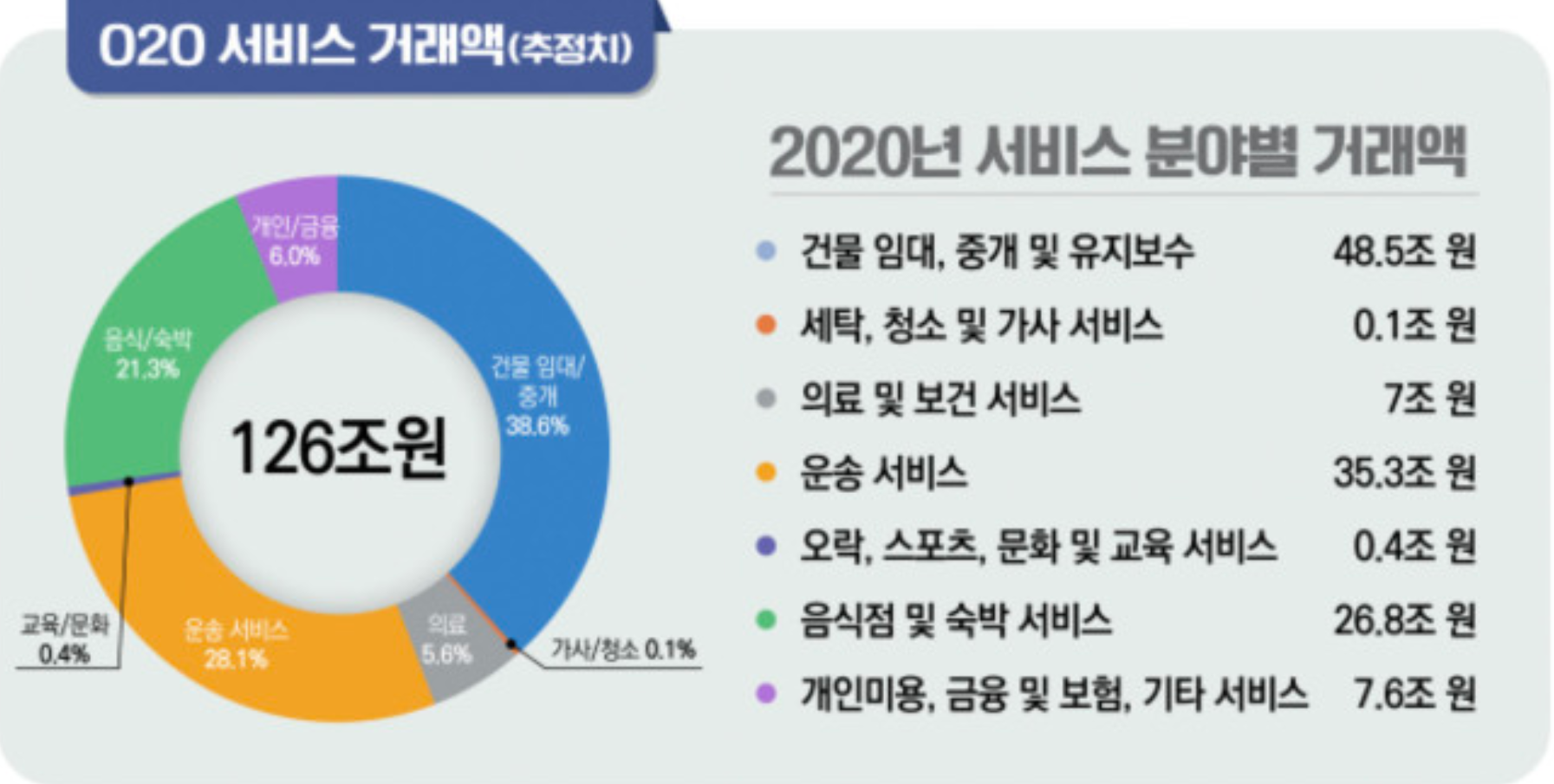 지난 4월 과학기술정보통신부는 O2O 서비스 산업조사 결과를 발표했는데요. 코로나 19로 인한 비대면 서비스의 수요가 늘어나고, 스마트폰 보급이 안정화됨에 따라 O2O(Online to Offline) 서비스 시장이 작년 97조원에서 29조원 증가한 126조원으로 급성장했습니다. 해당 거래액(추정치)은 아래와 같습니다.