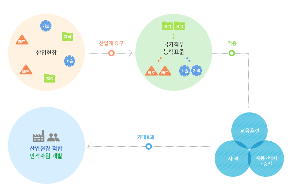 이와 같은 문제를 해결하기 위한 방안의 일환으로 2000년대 초부터 교육부, 고용노동부, 한국직업능력개발원 등의 공급자 중심으로 이원화되어 운영되어 온 교육-훈련-자격을 연계하고, 통합적․체계적인 인재개발 시스템 구축을 위한 방안으로 국가직무능력표준의 개발과 활용을 추진하여 왔습니다. 이는 직업교육훈련 및 자격제도에 수요자인 산업계의 참여를 확대시킴으로써 기존의 제도를 ‘공급자 중심’에서 ‘수요자 중심’으로, ‘투입 (income)중심’에서 ‘결과(outcome)중심’으로 인재개발 패러다임을 전환하는 것입니다.