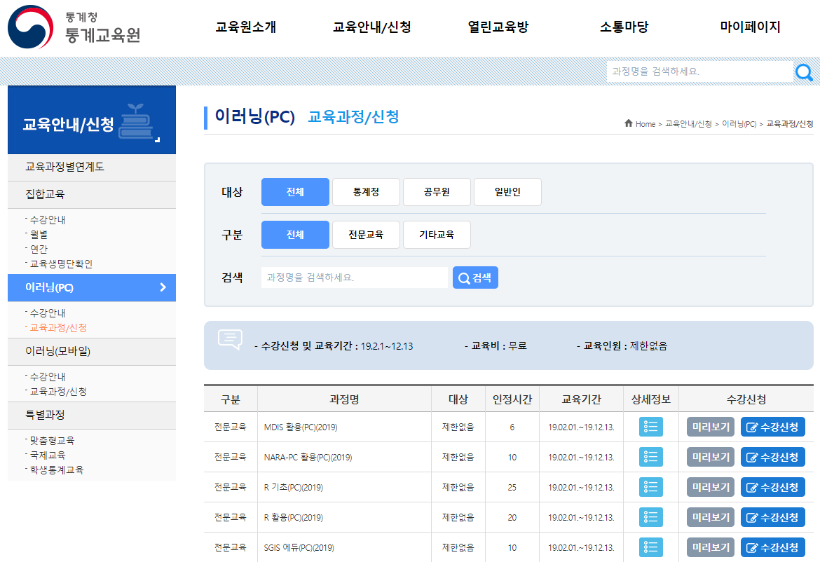 교육과정/신청>이러닝(PC)>교육안내/신청>통계교육원